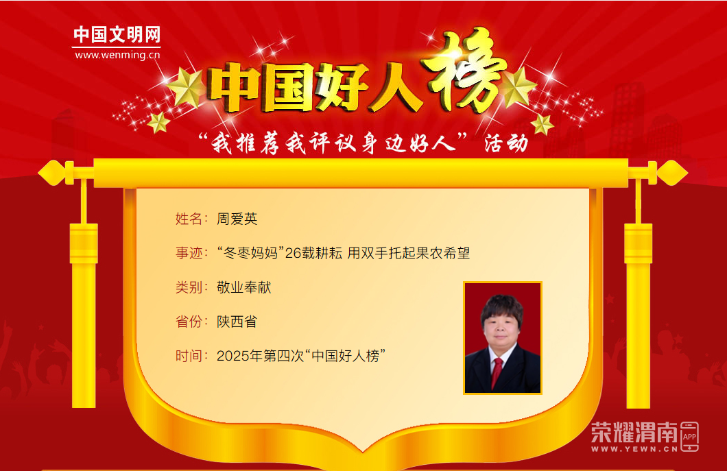 二十六载春秋如一日,周爱英将全部热情与智慧奉献给大荔冬枣产业,在技术推广、科研攻关、产业建言与应急救灾中彰显出一名基层科技工作者的初心与担当。她不仅助推冬枣成为闪亮的“地方名片”,更以实干精神书写了科技兴农、产业富民的动人篇章。