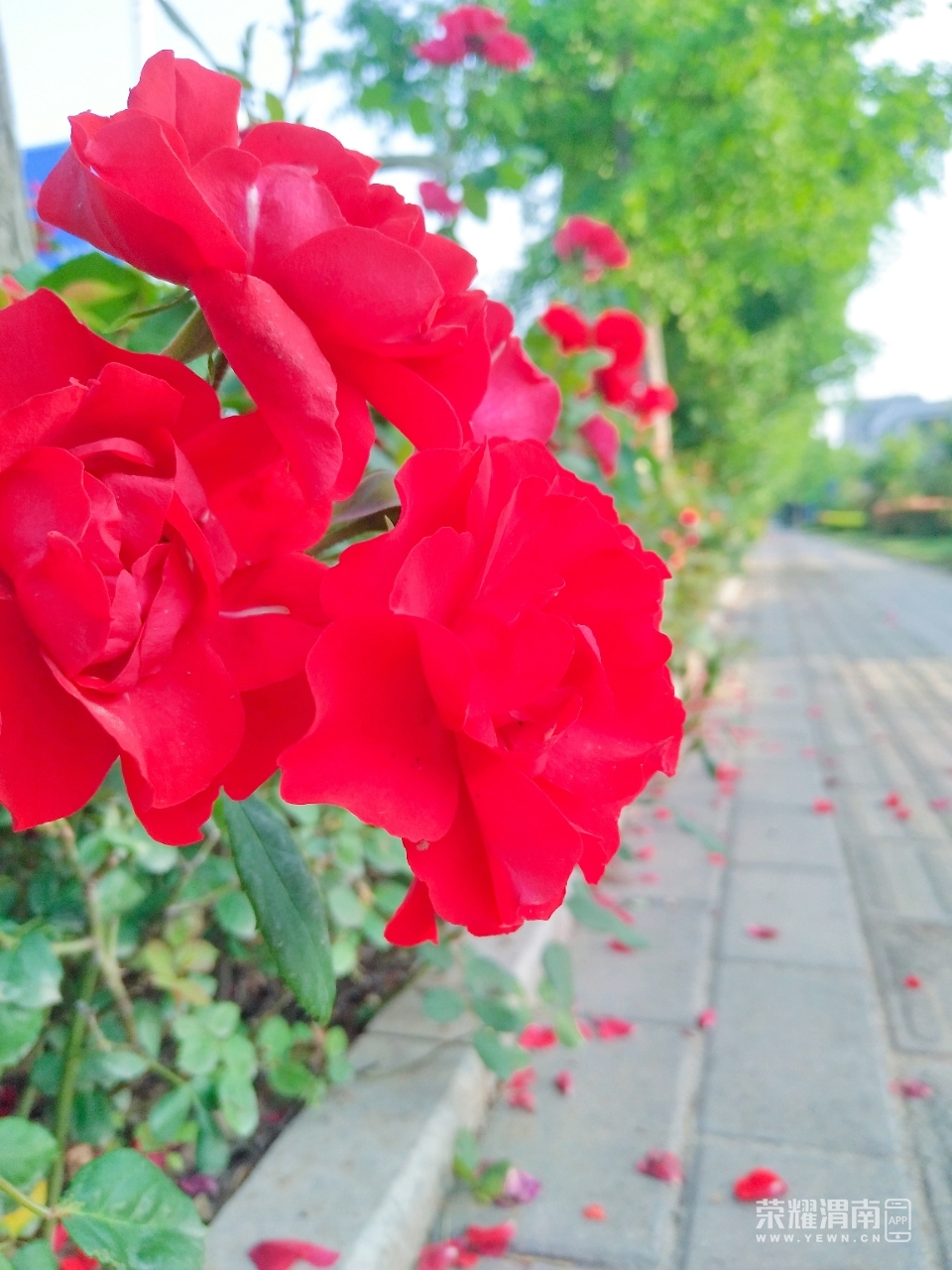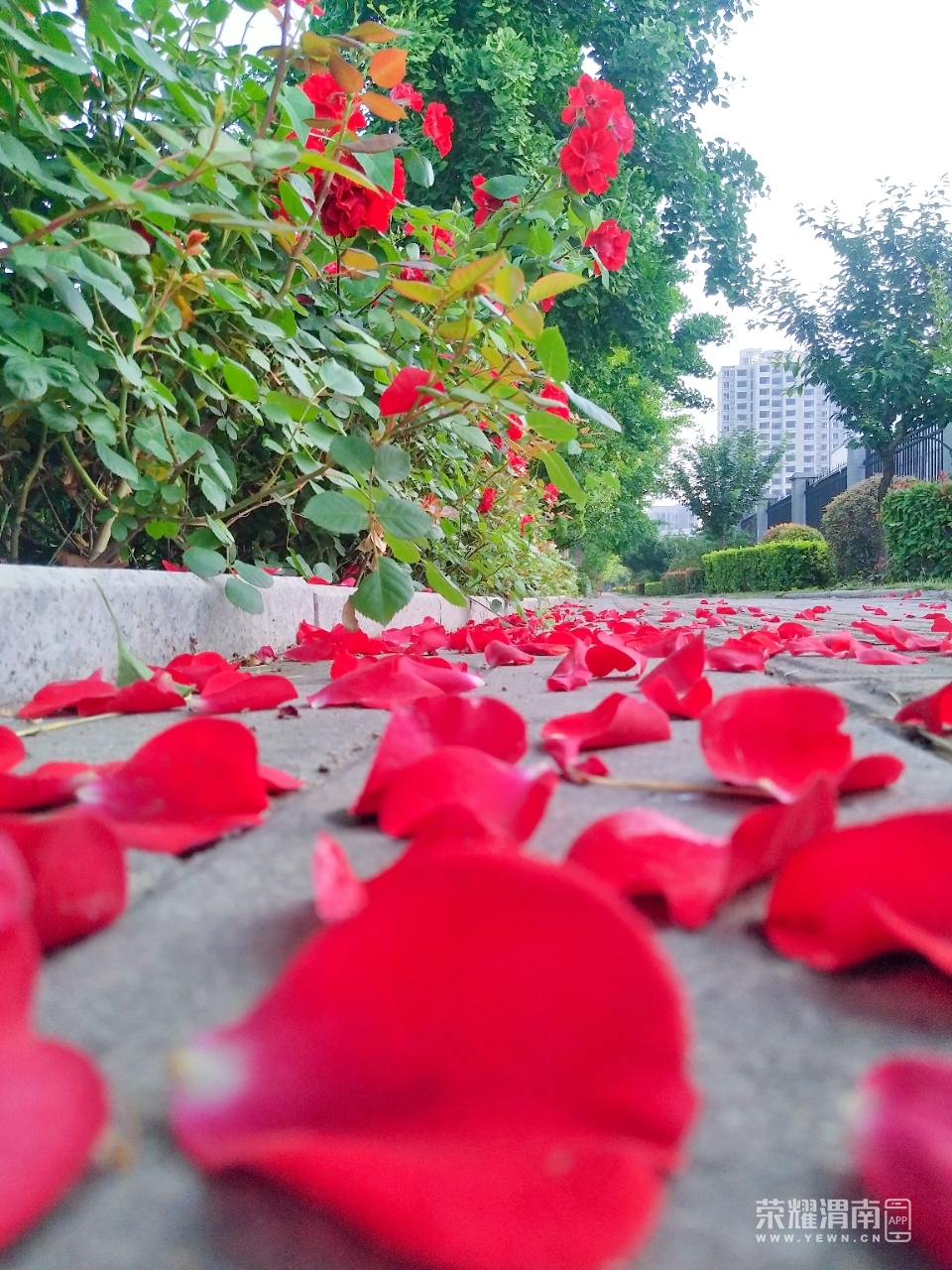 高新区崇业二路,人行道上的月季花花瓣开始飘落了,从这里过路有一种走红毯的感觉。想起了那句诗句“一花一世界,一叶一菩提”,美哉!
